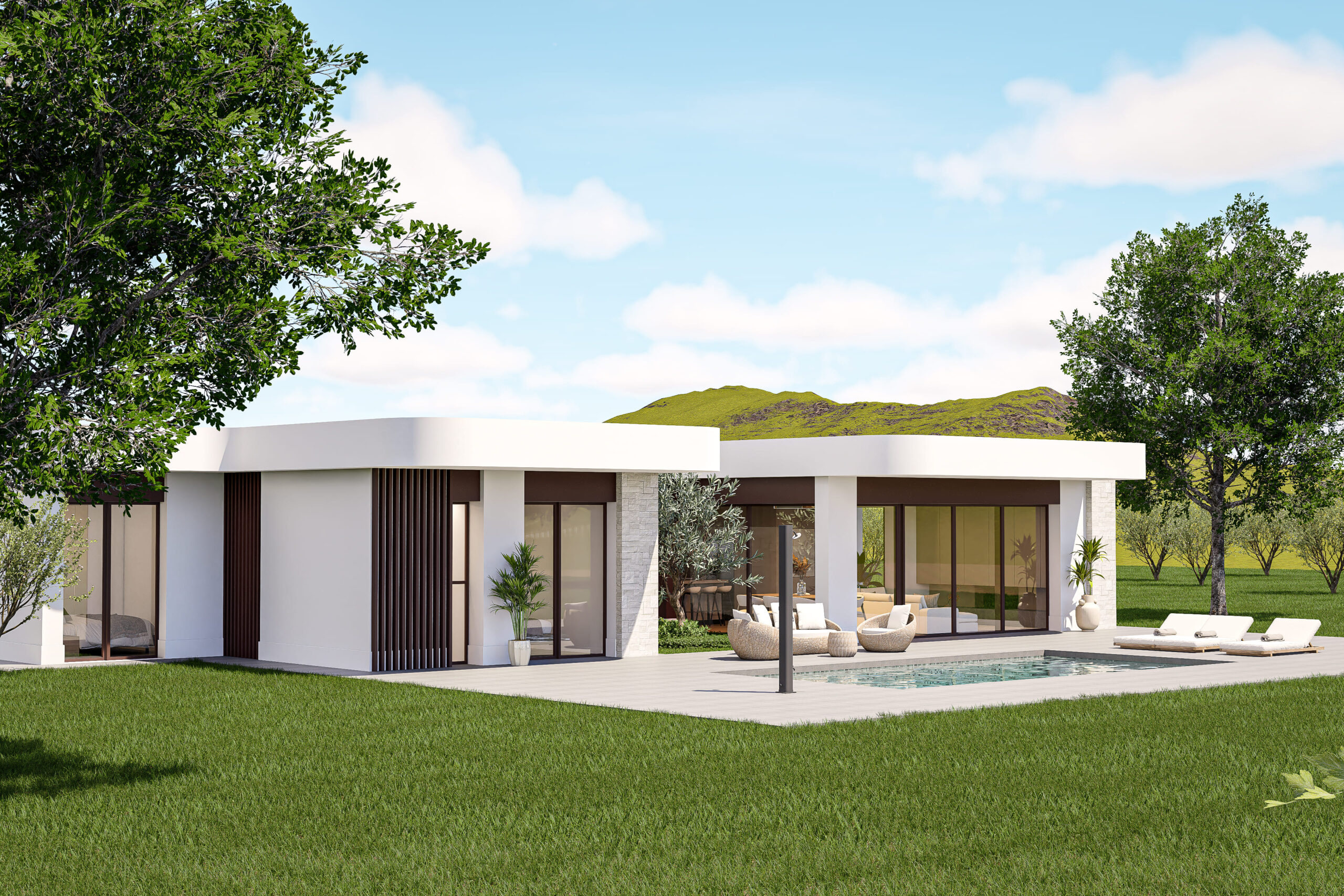 Einfache Drehzaun um die Villa (ca. 3.000 m²). Weißer Kies um die Villa (1.000 m²). Motorisiertes Schiebetor. Komplette Grundstücksfläche von 27.467 m².
